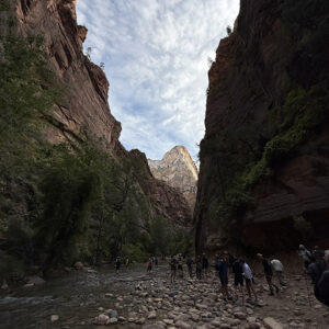 There are actually two hikes you can take on this path. The Riverside walk is the first, which is a 1-mile paved trail. It ends at a spot where the canyon narrows, and the only way farther is upriver. This section is appropriately called The Narrows. This second section allows you to navigate up the river via several twists and turns. Hikers going up the Narrows obtain hiking sticks, tall rubber boots, or chest waders from the park office. Due to time constraints and physical limitations, our group only hiked the Riverside section.